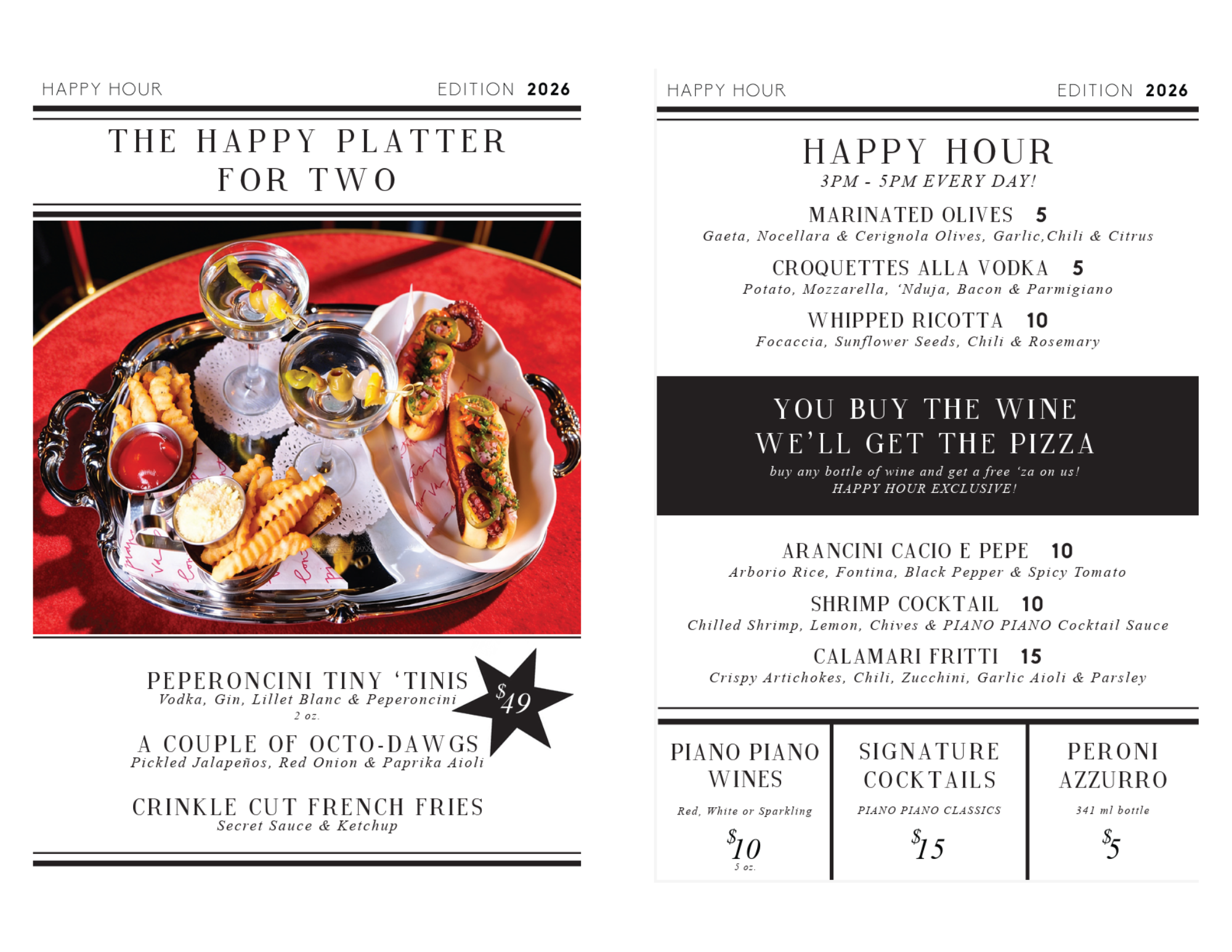 Each and every day on the Happy Hour menu, our Drink Specials range from $5 - $15 for beer, zero-proof cocktails, wines by the glass, and PIANO PIANO Signature Cocktails; and Food Specials are snack & sharing size, and range from $5 - $15 for dishes like Marinated Olives, Shrimp Cocktail, Calamari Fritti and more! Click here to view our entire Happy Hour menu!